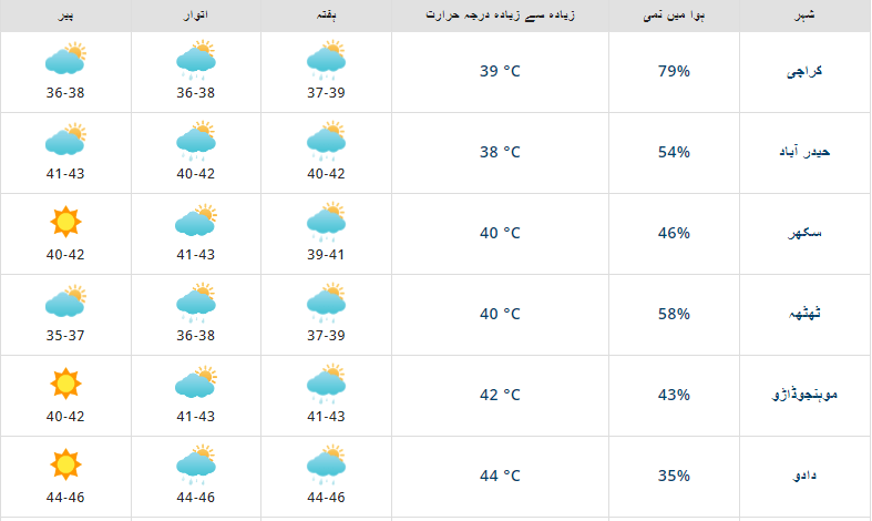 حکمہ موسمیات کی جانب سے جاری رپورٹ میں بتایا گیا تھا کہ آج سکھر، کشمور ، خیر پور ، لاڑکانہ، دادو ،بدین، ٹھٹھہ، سجاول، کراچی، جیکب آباد، شکار پور، شہید بینظیر آباد، حیدرآباد، تھرپارکر، عمرکوٹ، مٹھی، میرپور خاص اور سانگھڑ میں چند مقامات پر تیز ہواؤں اور گرج چمک کے ساتھ بارش کی توقع ہے۔