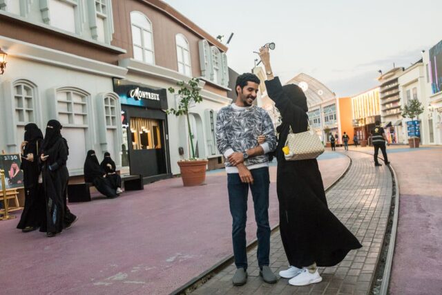 On a recent Friday night at Medd Café, the outdoor patio was crowded with young men and women. Many of the women wore their hair uncovered and their Abayas open over jeans and sneakers, styling them more like long, fluid jackets than the traditional all-covering gowns. A couple at The Boulevard was seen in romantic mood while going through streets of Riyadh. It truly represents a picture of Modernized Saudi Arabia.